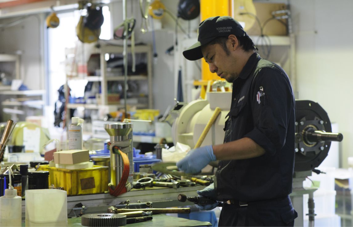 自社や多種多様なメーカーの真空ポンプの修理から動作テストまでを行っています。 また、営業担当などと新規のお客様を訪問することもあり、チームワークも大切にしながら日々の業務を行っています。